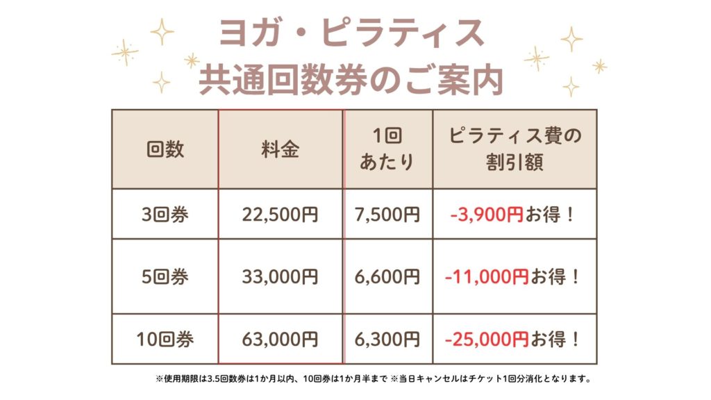 当スタジオではヨガ・ピラティスのどちらでもお使いいただける「共通回数券」をご用意しました。都度払いよりもずっとお得に、ご自身のペースで通っていただけます。10回券をご利用いただくと、1回あたり約2,500円もお得にレッスンを受けていただけます。トータルではなんと最大25,000円分の優待となります!