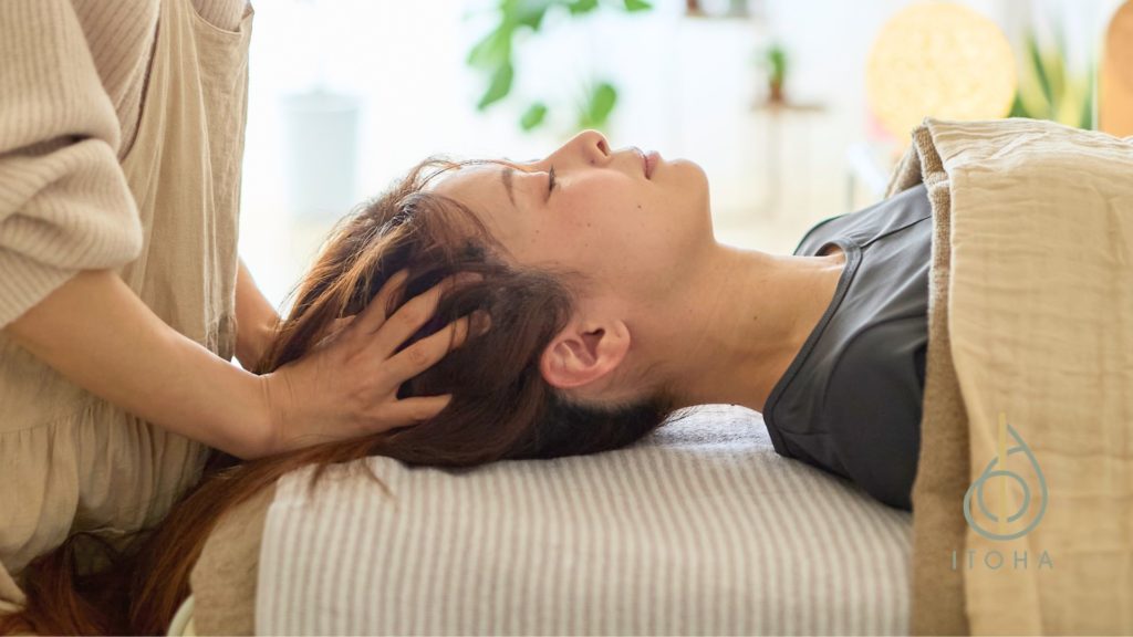 ITOHAのヘッドスパで最も大切にしているのは、「指先からお客様へ伝わる安心感」です。マニュアル通りに力任せに揉むのではなく、お客様お一人おひとりのその日の状態や筋肉の硬さに合わせ、絶妙な圧で丁寧にアプローチしていきます。 セラピストであるKAZUMIやAZUSAが、お客様のゆったりとした呼吸にリズムを合わせながら、こわばった頭皮の深部へとじんわりアプローチ。まるで瞑想をしているかのような、心地よい微睡(まどろみ)へと誘います。単なる表面的なリラクゼーションではなく、心と身体の繋がりを意識した施術だからこそ、終わった後には憑き物が落ちたような、深いレベルでのリセット感を味わっていただけます。